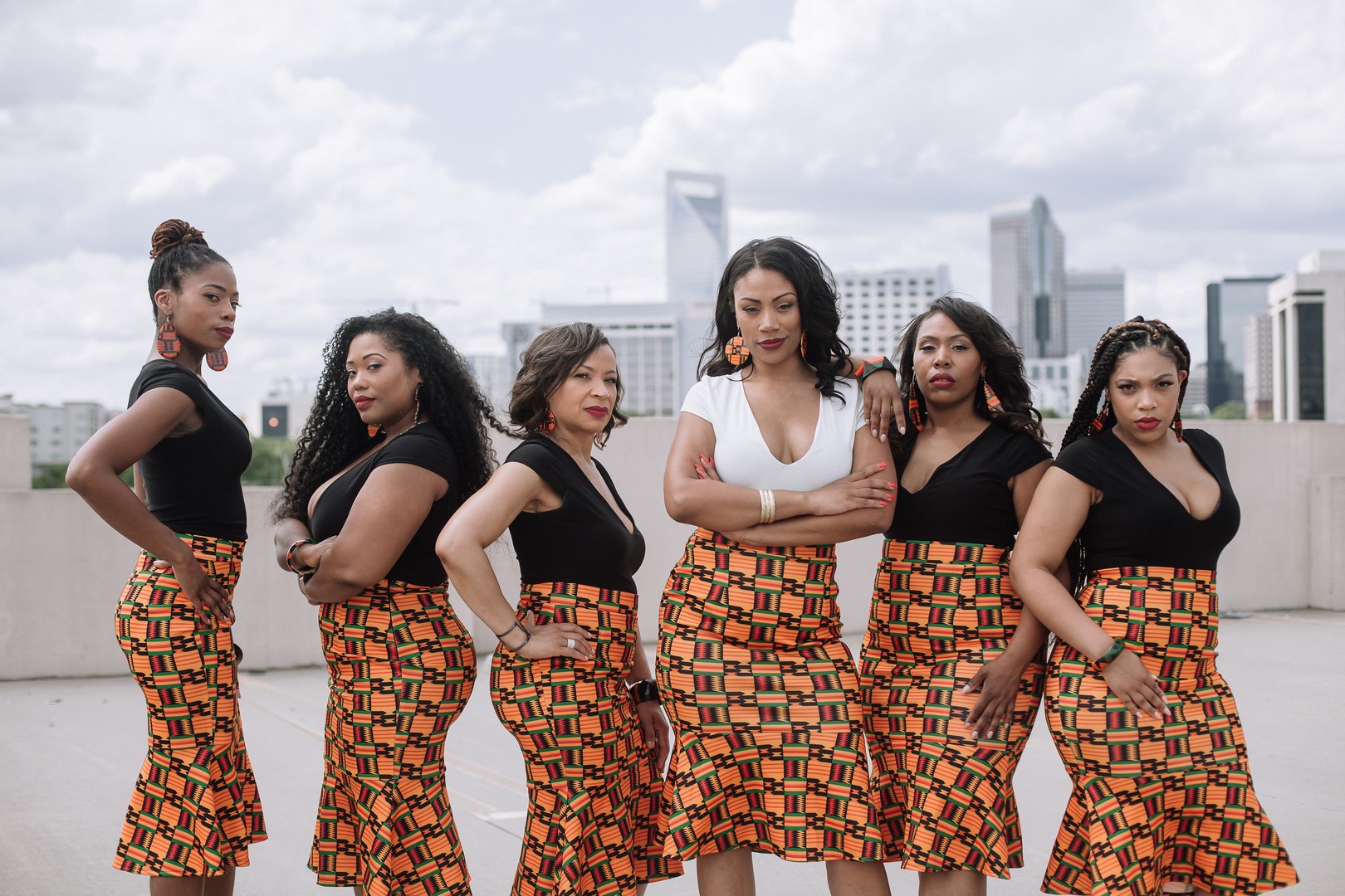 Tosha wanted to display her and her fiance’s cultural roots at not only their wedding but also doing Tosha’s bachelorette party. She got her girls together, they styled themselves like professionals and came to slay. We met on a rooftop to get a nice Charlotte skyline and grabbed some awesome shots of Tosha and her bridesmaids. –Amanda Moss Photography
