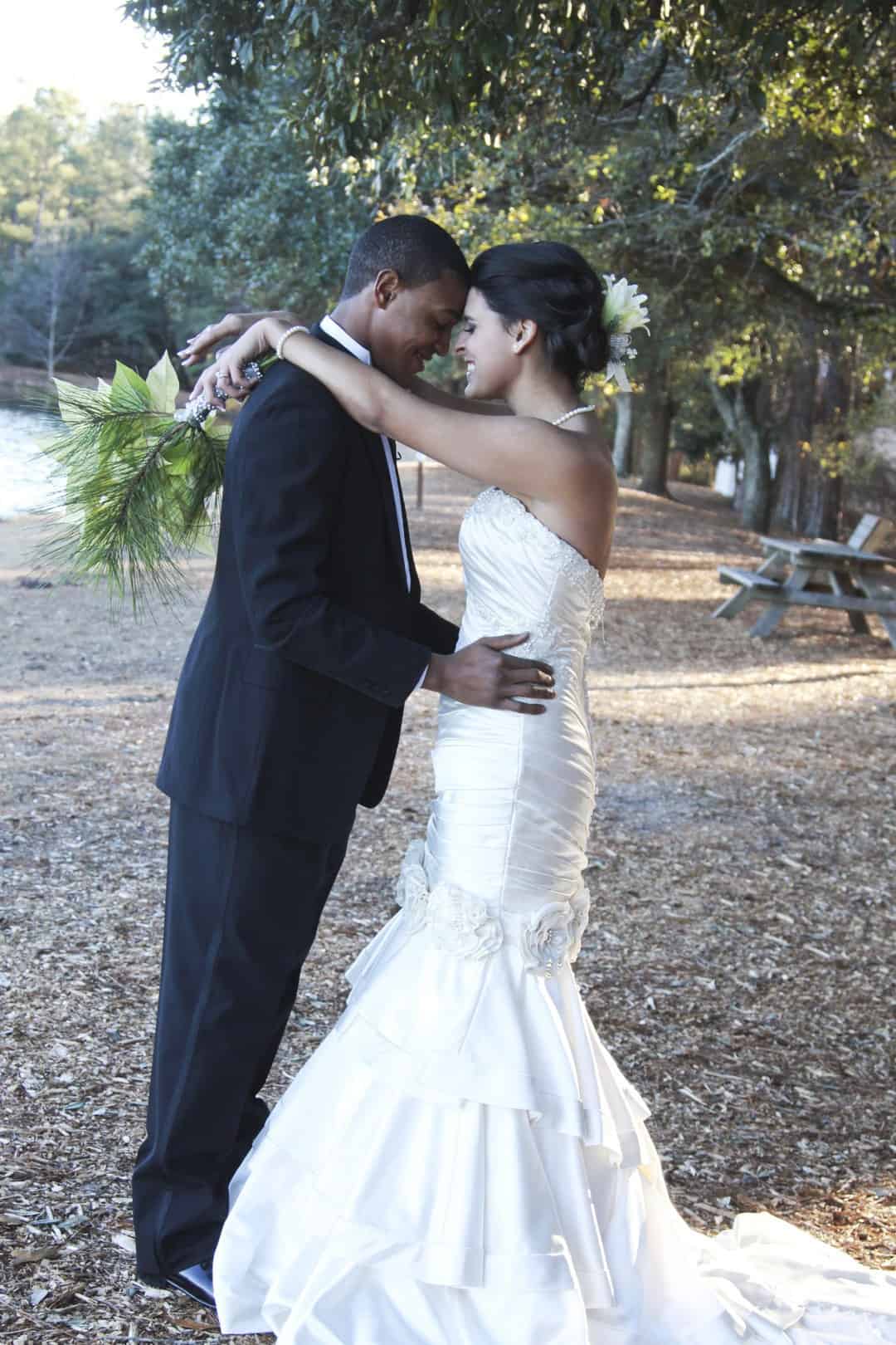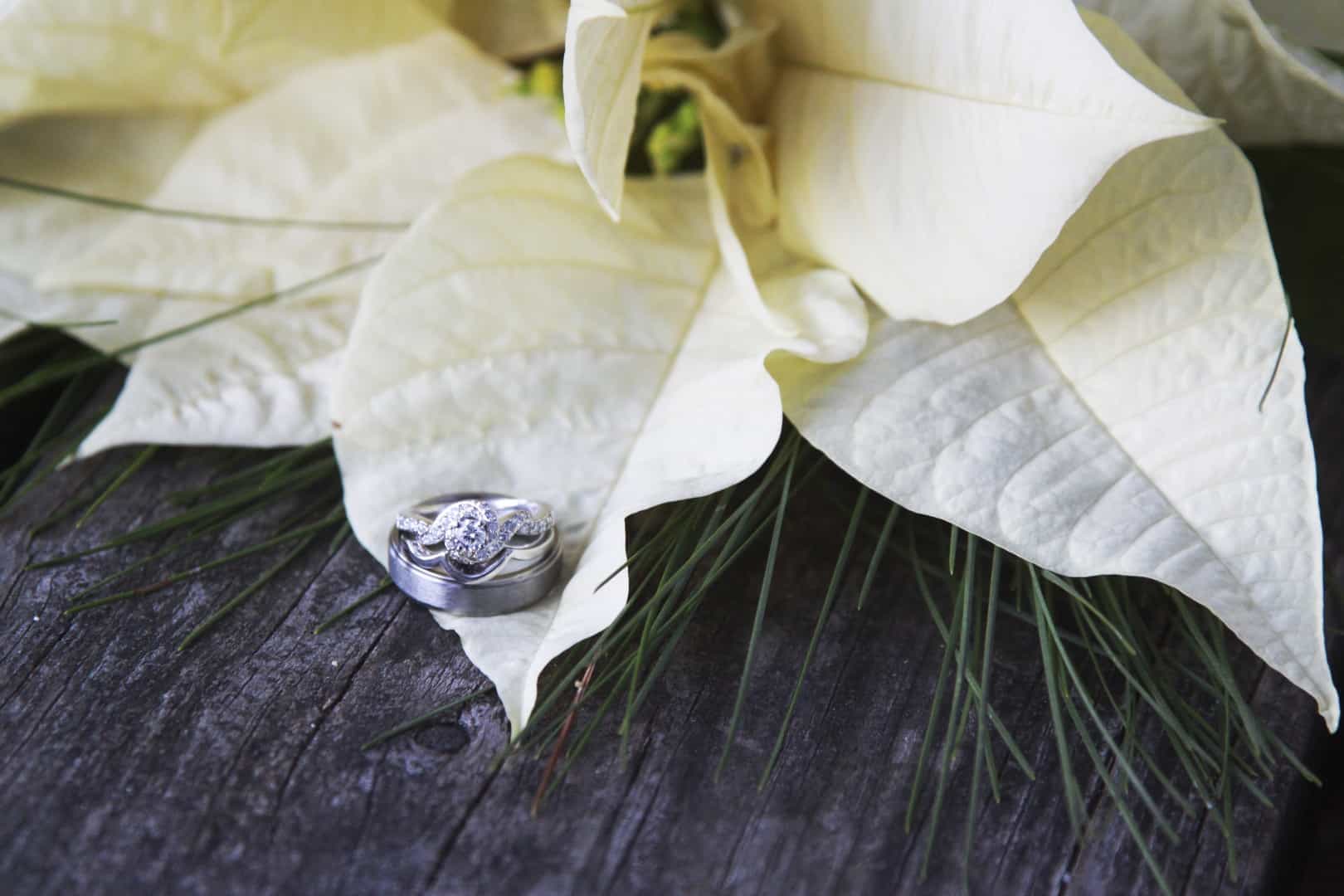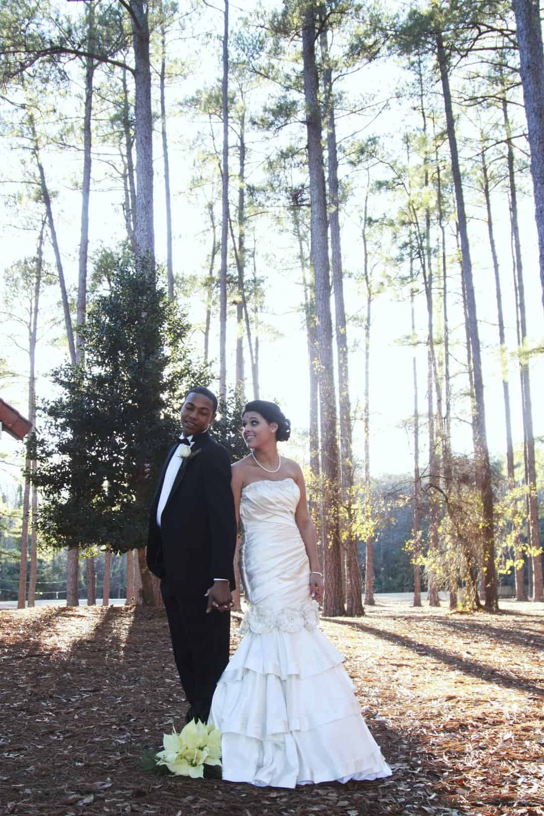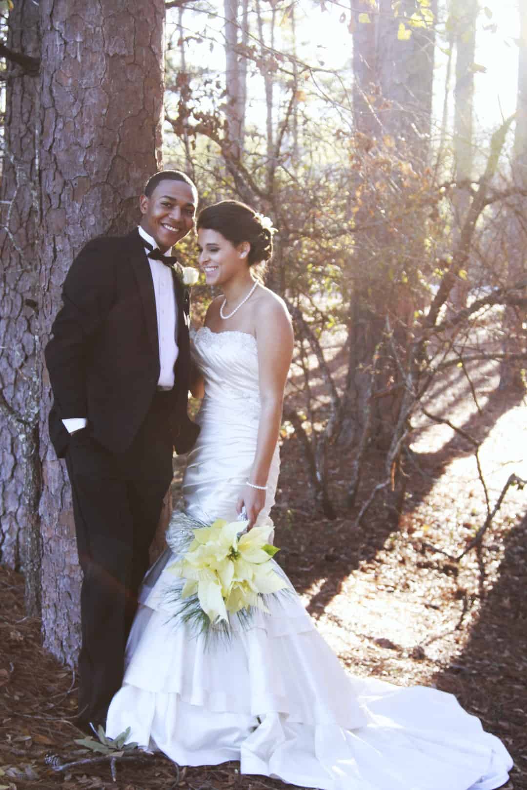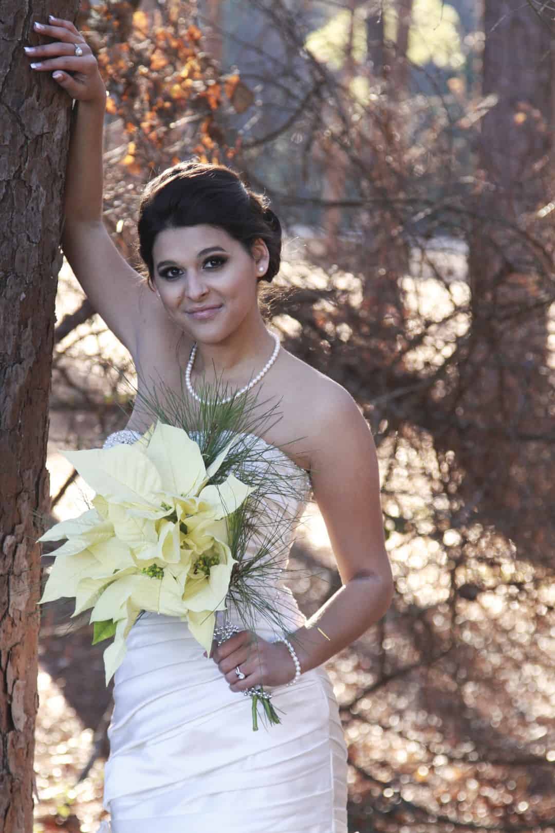 As told by D’Attoma Studios: As a photographer, I’d always wanted to do a styled wedding shoot. I contacted Callie Bell who is an aspiring model and decided to ask Kenyatta to be the groom, who had never modeled before. I thought it would bring a realistic aspect to the shoot, and they both connected and had a wonderful time together – and it showed. I decided to plan a Christmas inspired, DIY shoot, complete with a poinsettia bouquet, evergreen springs in the bride’s hair, a rustic woodsy setting, and to contrast, a sparkly reception tablescape in the middle of the woods. We worked with some amazing vendors who donated everything from the wedding gown, engagement rings, cake table and more. I am proud of the finished product and hope that our brides can use these ideas to implement into their own wedding plans!