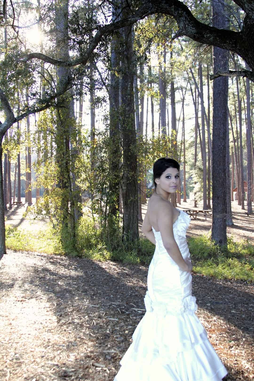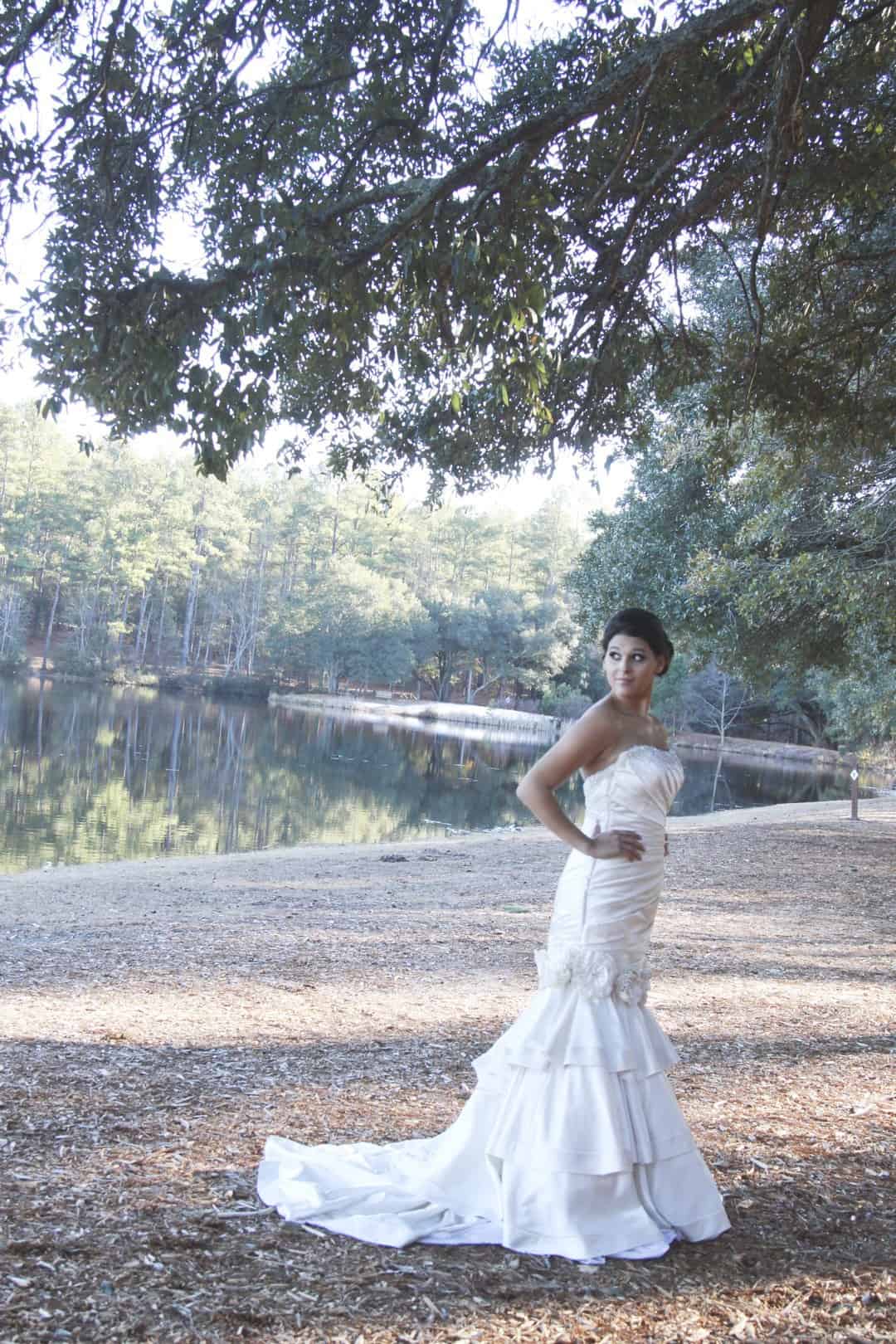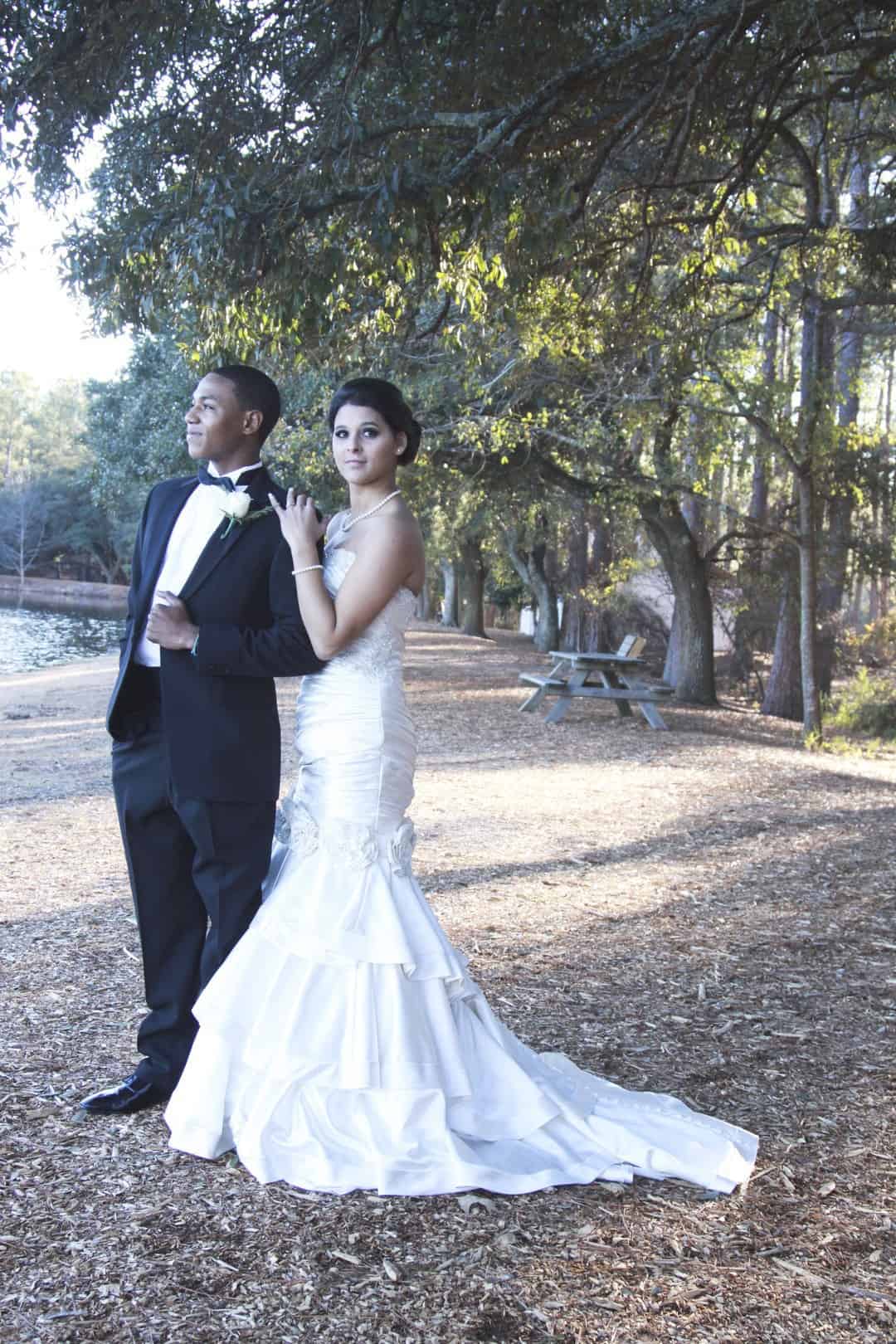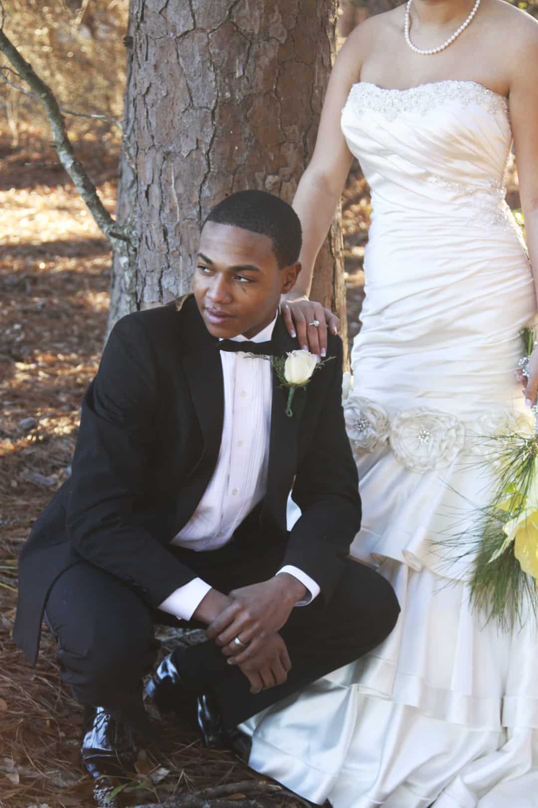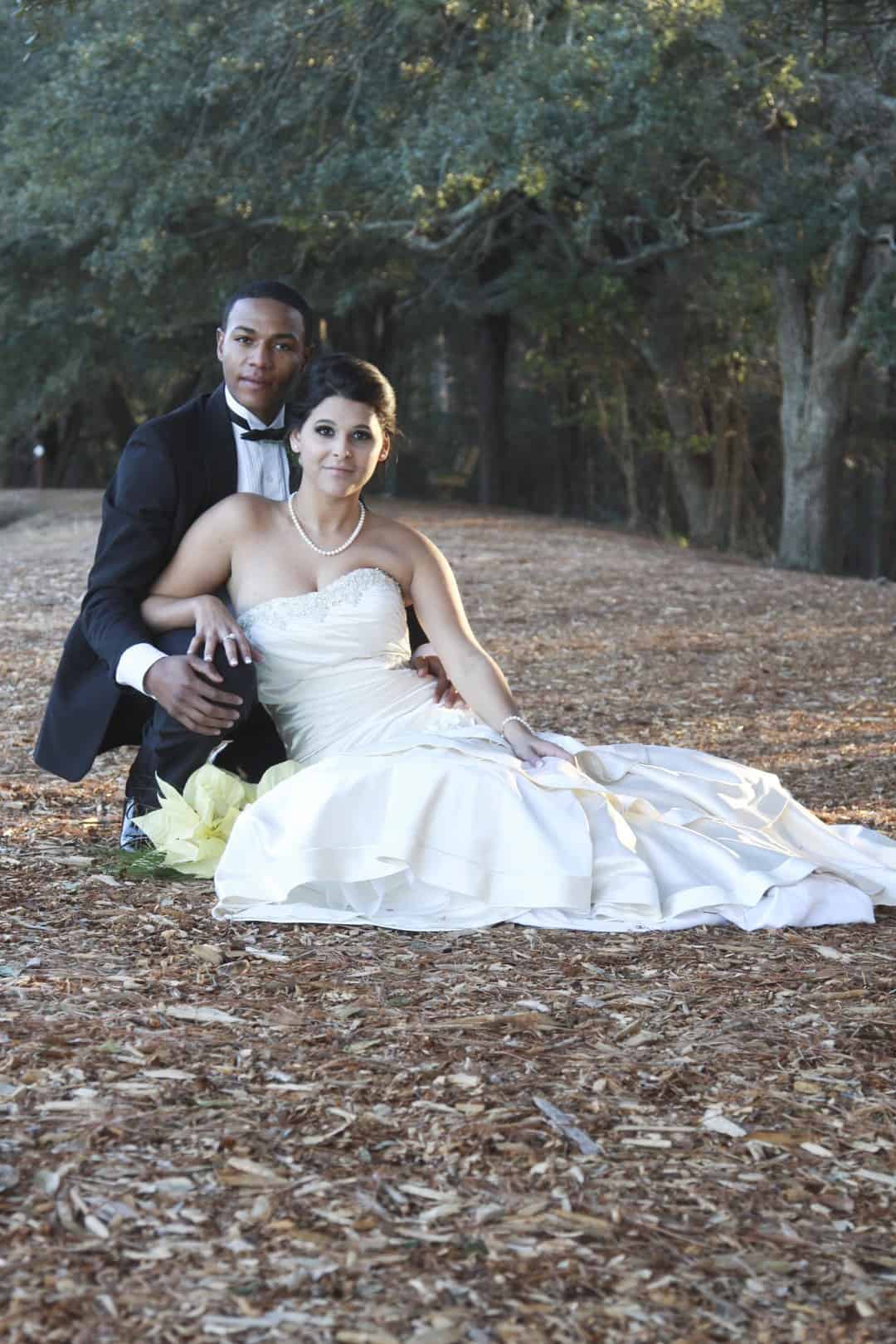 As told by D’Attoma Studios: As a photographer, I’d always wanted to do a styled wedding shoot. I contacted Callie Bell who is an aspiring model and decided to ask Kenyatta to be the groom, who had never modeled before. I thought it would bring a realistic aspect to the shoot, and they both connected and had a wonderful time together – and it showed. I decided to plan a Christmas inspired, DIY shoot, complete with a poinsettia bouquet, evergreen springs in the bride’s hair, a rustic woodsy setting, and to contrast, a sparkly reception tablescape in the middle of the woods. We worked with some amazing vendors who donated everything from the wedding gown, engagement rings, cake table and more. I am proud of the finished product and hope that our brides can use these ideas to implement into their own wedding plans!