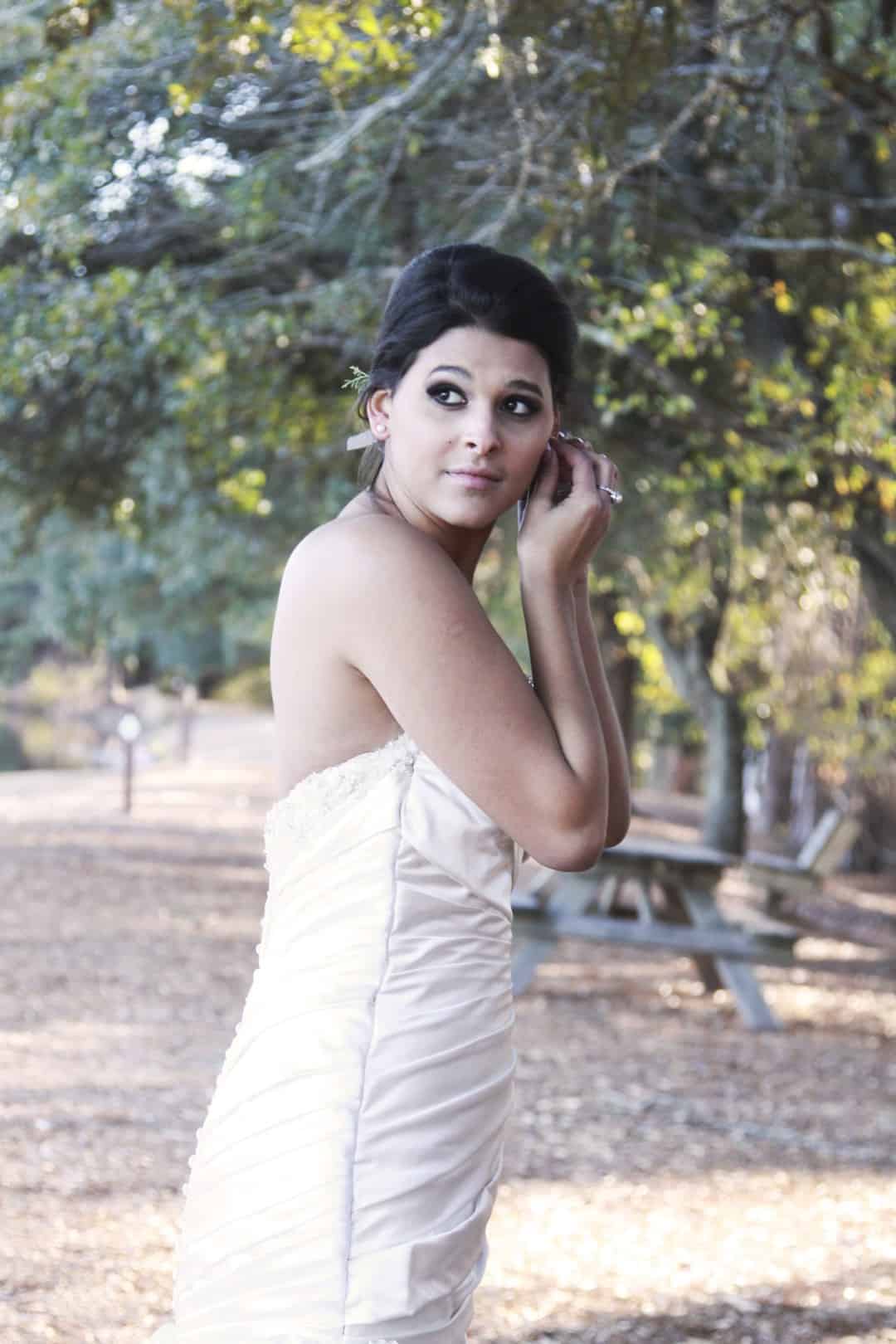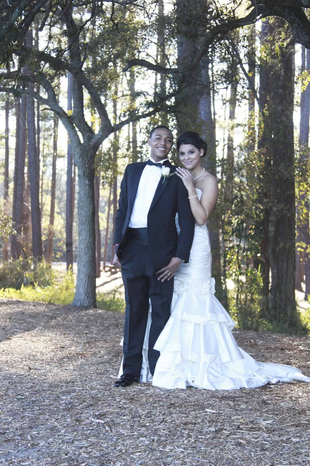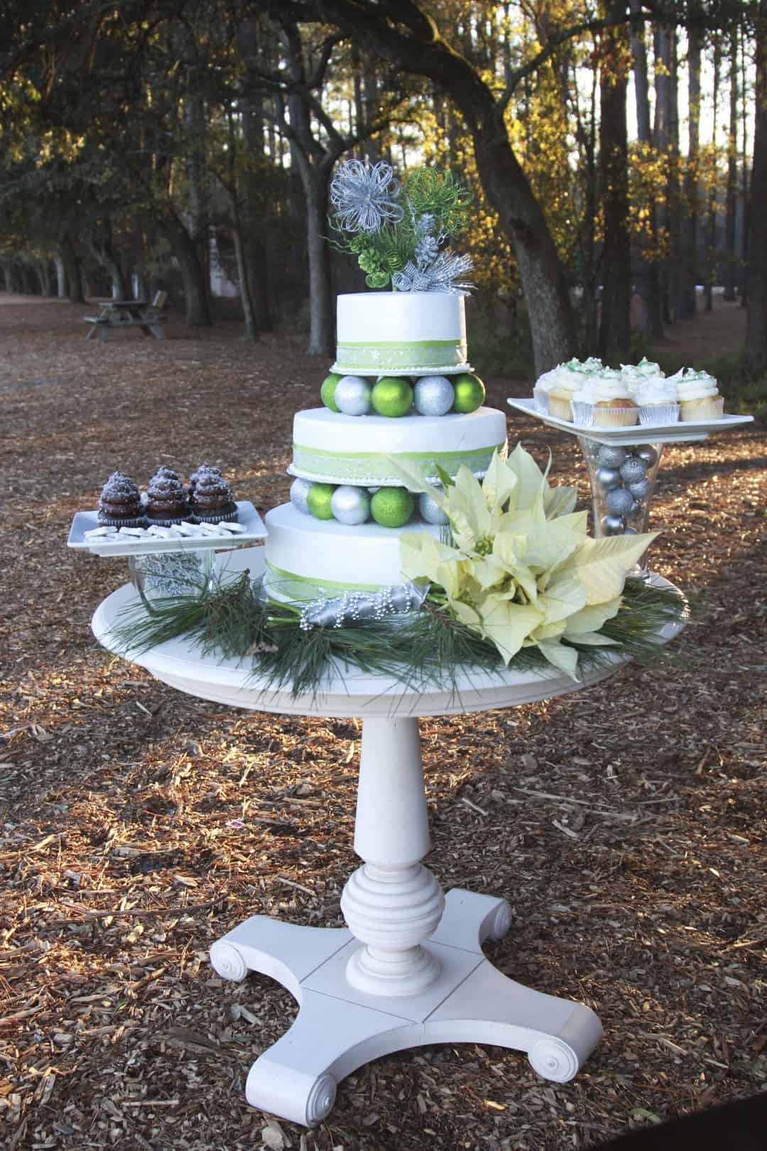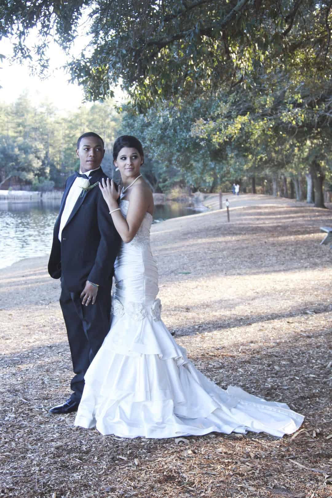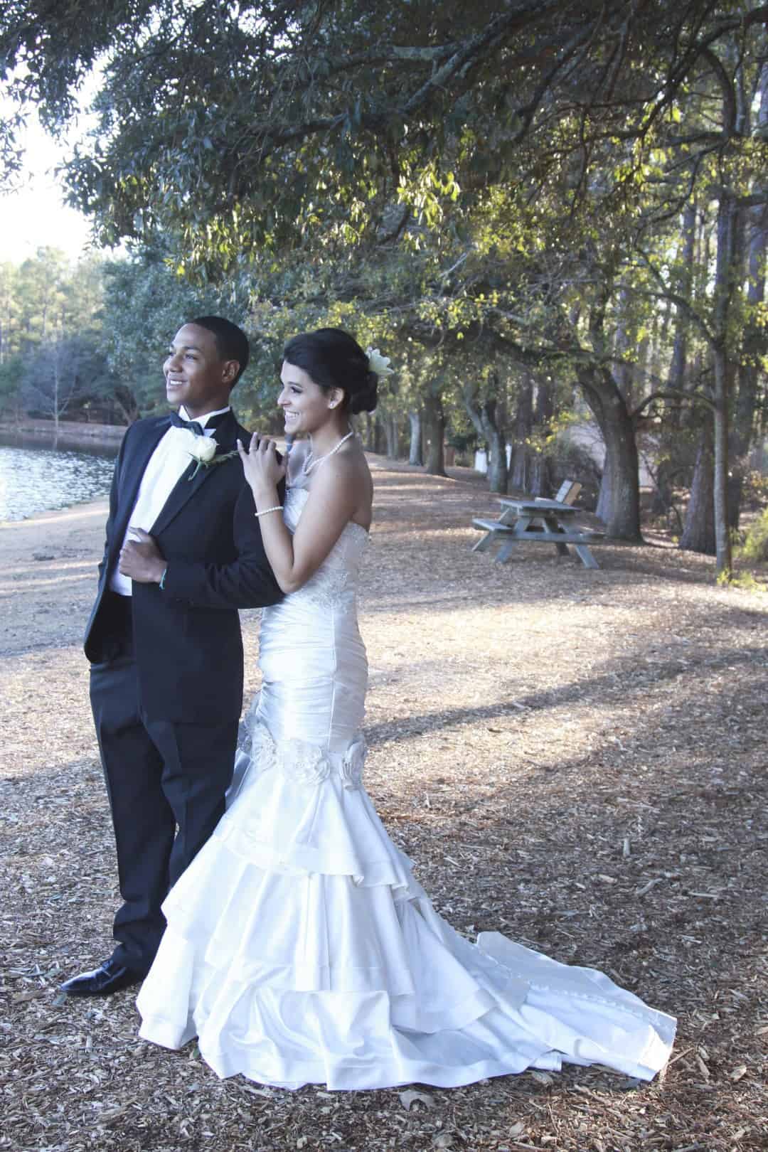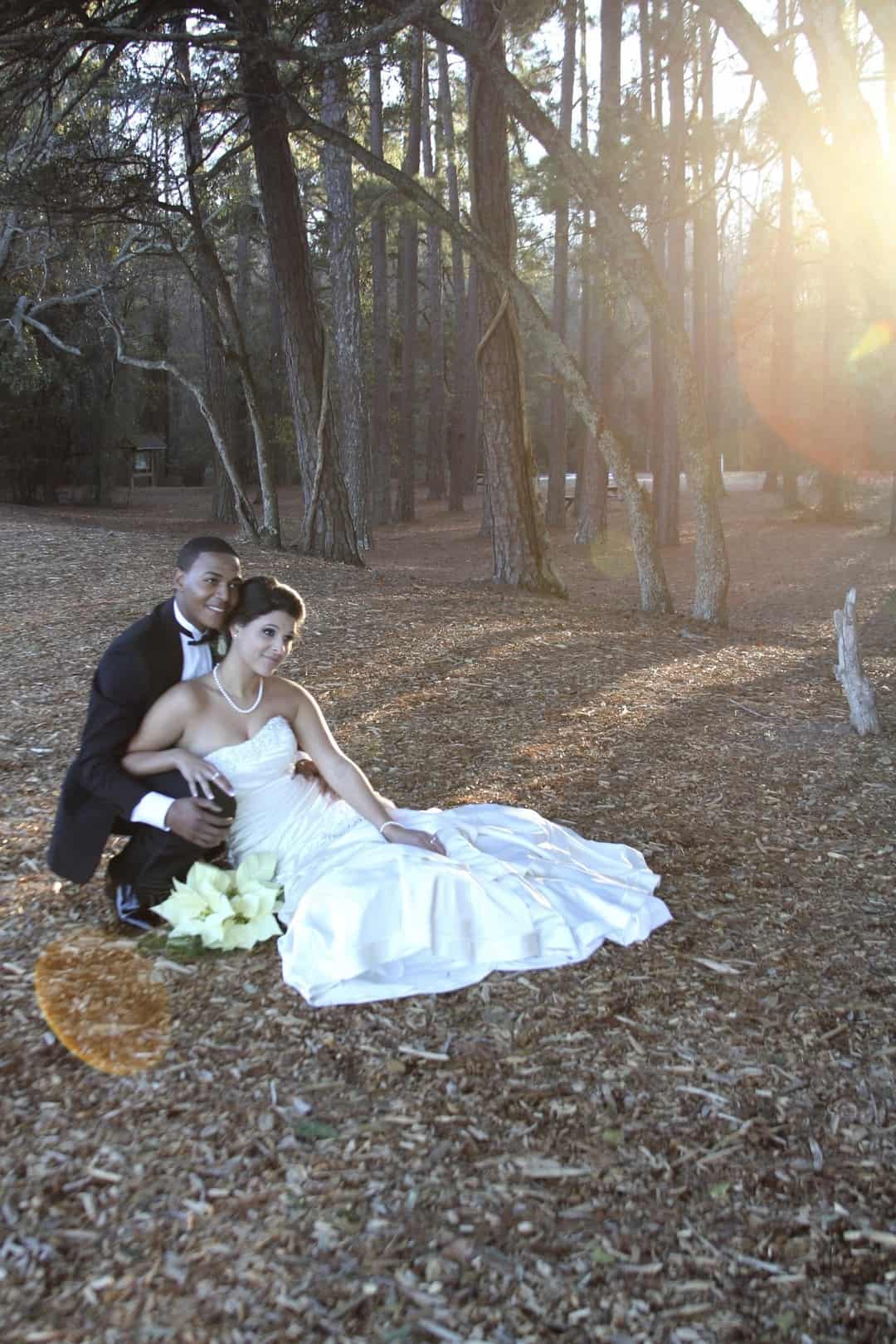 As told by D’Attoma Studios: As a photographer, I’d always wanted to do a styled wedding shoot. I contacted Callie Bell who is an aspiring model and decided to ask Kenyatta to be the groom, who had never modeled before. I thought it would bring a realistic aspect to the shoot, and they both connected and had a wonderful time together – and it showed. I decided to plan a Christmas inspired, DIY shoot, complete with a poinsettia bouquet, evergreen springs in the bride’s hair, a rustic woodsy setting, and to contrast, a sparkly reception tablescape in the middle of the woods. We worked with some amazing vendors who donated everything from the wedding gown, engagement rings, cake table and more. I am proud of the finished product and hope that our brides can use these ideas to implement into their own wedding plans!