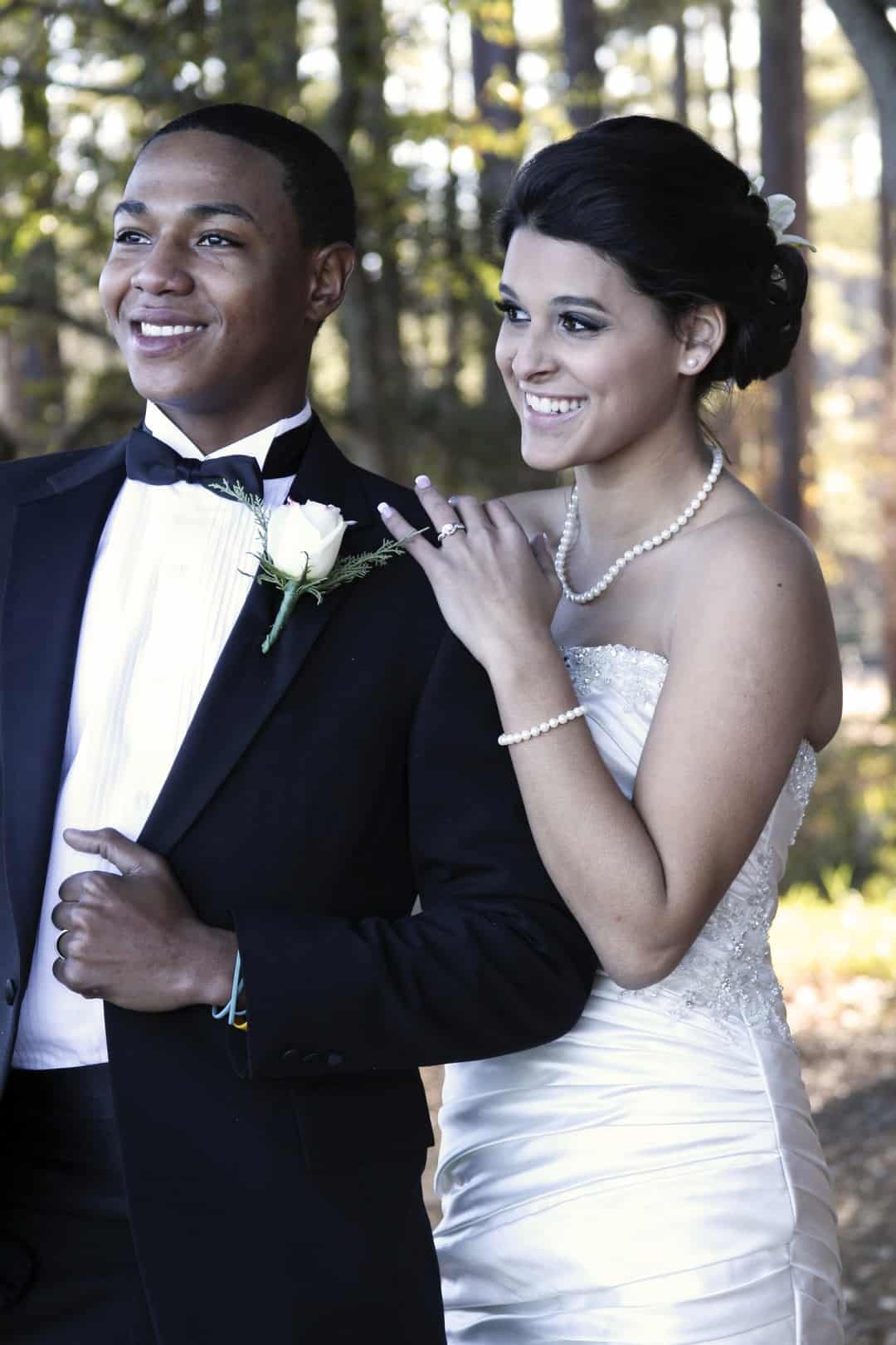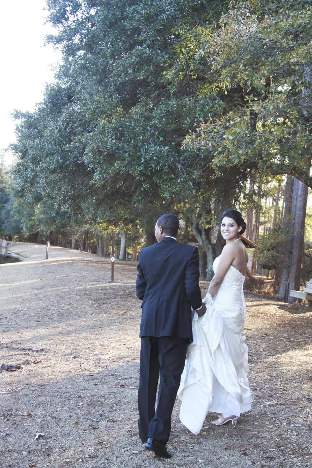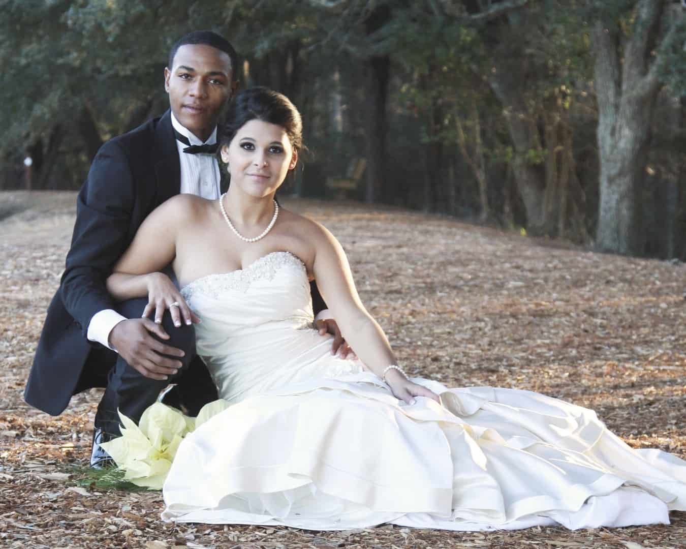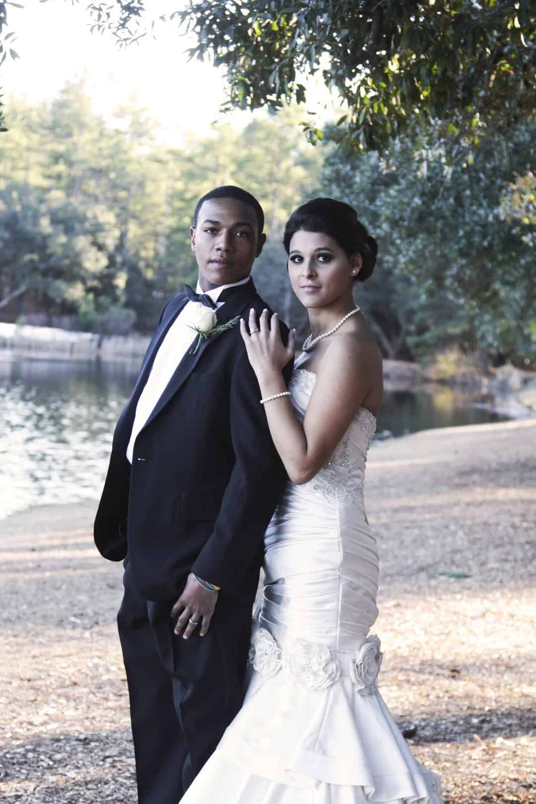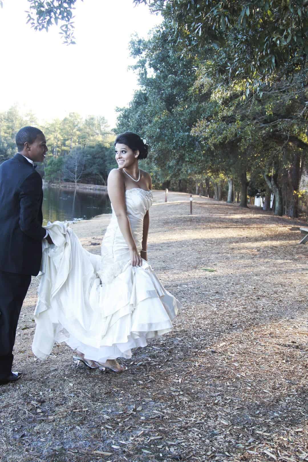 As told by D’Attoma Studios: As a photographer, I’d always wanted to do a styled wedding shoot. I contacted Callie Bell who is an aspiring model and decided to ask Kenyatta to be the groom, who had never modeled before. I thought it would bring a realistic aspect to the shoot, and they both connected and had a wonderful time together – and it showed. I decided to plan a Christmas inspired, DIY shoot, complete with a poinsettia bouquet, evergreen springs in the bride’s hair, a rustic woodsy setting, and to contrast, a sparkly reception tablescape in the middle of the woods. We worked with some amazing vendors who donated everything from the wedding gown, engagement rings, cake table and more. I am proud of the finished product and hope that our brides can use these ideas to implement into their own wedding plans!