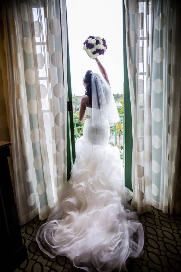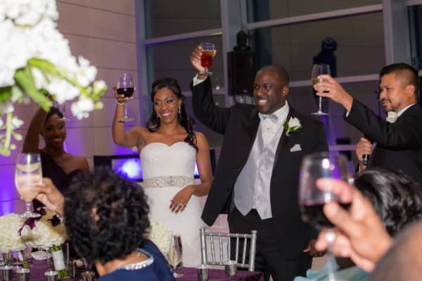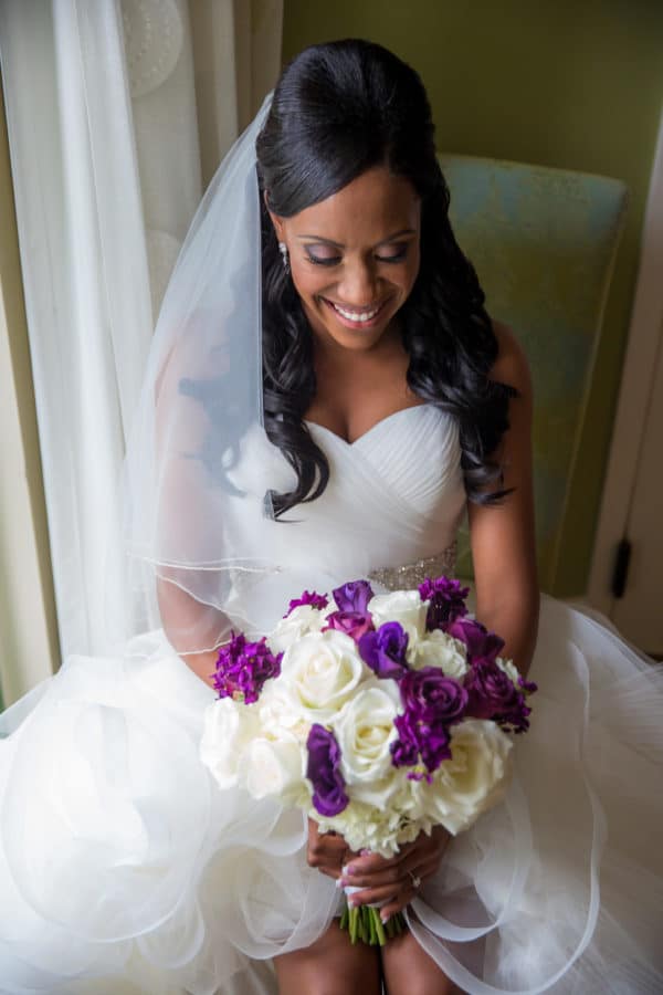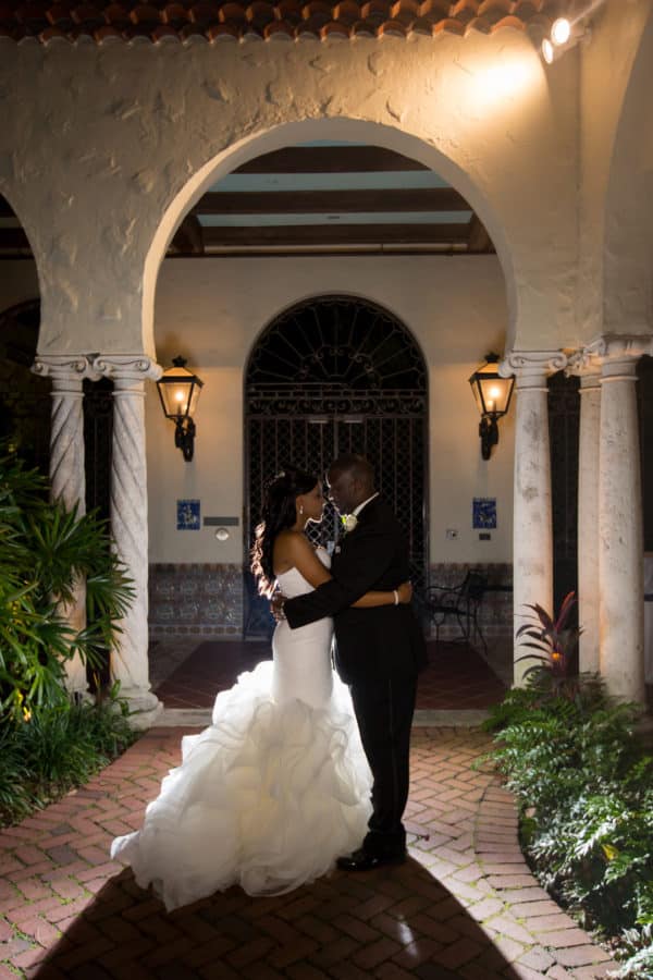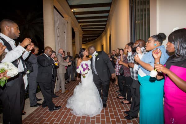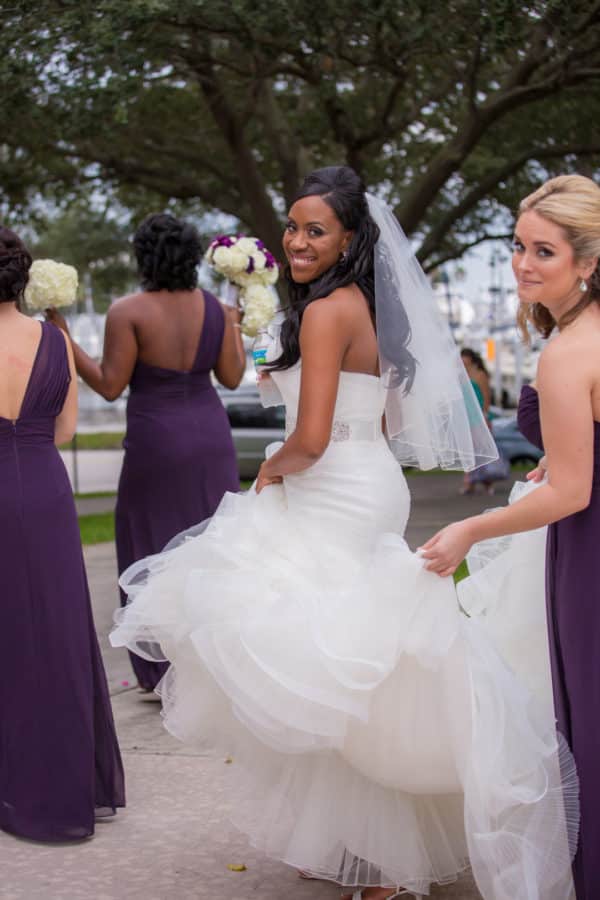 As told by Head Over Heels Photography: When Marcus, an IT Director, proposed to Jillian, an Elementary School Teacher, he did so at a baroque historic Steakhouse in Tampa known for their formal decor and attentive experience. They brought that same elegance and sophistication to their wedding celebration, choosing the beautiful setting of the Museum of Fine Arts in St. Petersburg as their venue. The bride looked stunning in her mermaid gown with a rhinestone belt, flanked by her friends and bridesmaids in chic eggplant dresses. Classic white flowers with striking purple accents with sparkling crystals and candlelight elevated the ceremony and reception decor. The couple participated in a unique unity ceremony where they blended two wines together to drink from a single cup, symbolizing their union. Guests enjoyed chef-attended food stations as well as a decadent chocolate fountain and a four-tier buttercream wedding cake. The dance floor was packed all night (as was the photo booth!) and guests sent off the bride and groom through a path of bubbles along the museum veranda.